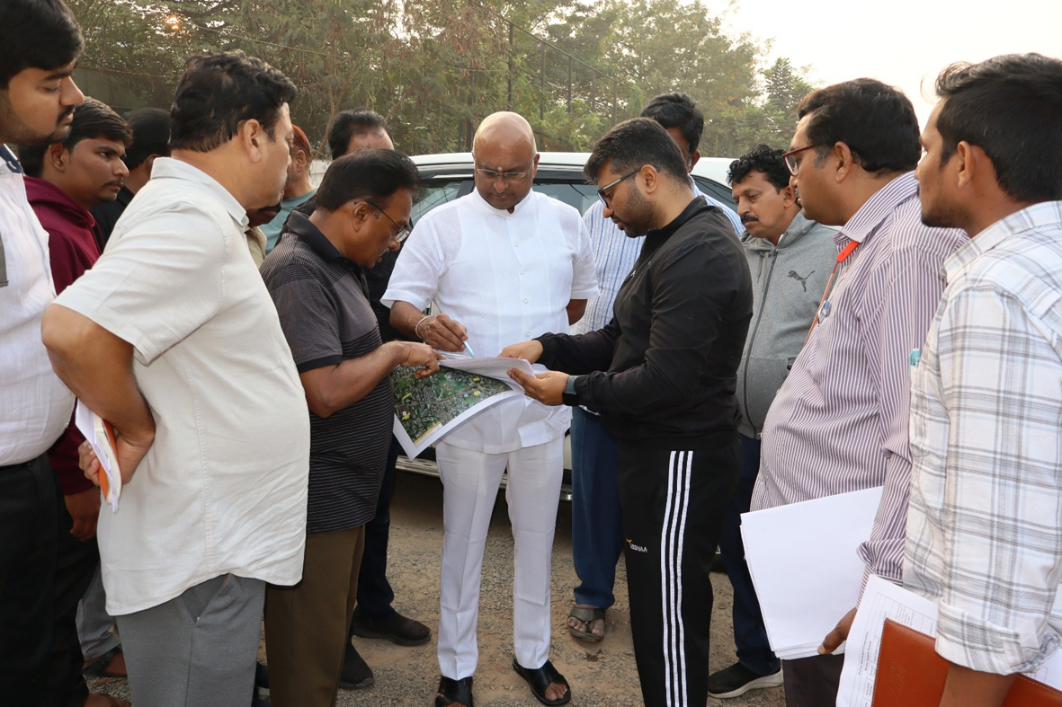 ఆర్వోబీ నిర్మాణ పనులను పరిశీలించి అధికారులతో మాట్లాడుతున్న మేయర్ రవీంద్ర, కమిషనర్ మయూర్ అశోక్
